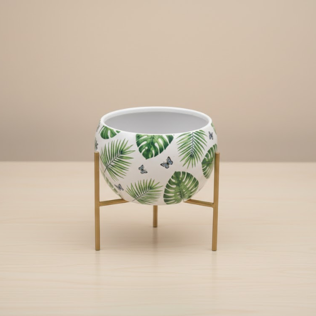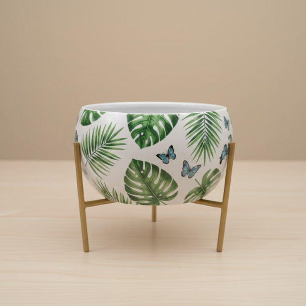 This diverse collection of iron and steel planters with stands brings together artistic design, durability, and functionality to enhance your plant displays and home décor. Each planter is meticulously crafted from high-quality steel for rust resistance and longevity, featuring vibrant patterns including floral, mosaic, marble, and tropical motifs. Designed with compact sizes of pot height 10 cm, diameter 13 cm, and stand height 7 cm, these planters are perfect for small to medium indoor plants, offering a decorative yet practical way to brighten any space. The sturdy stands elevate plants to eye-level for better viewing and add an elegant touch to desks, shelves, or windowsills.
