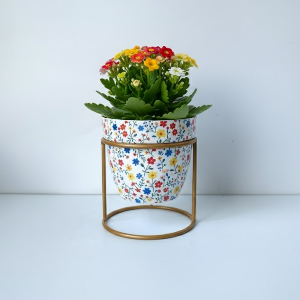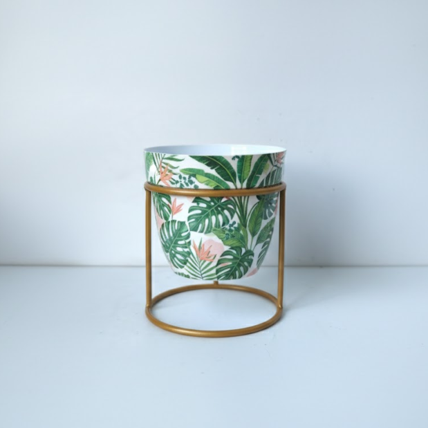 Add artistic flair and botanical charm to your décor with these Small Pots with Stand (Model 132 DEF), made from high-quality steel and designed in vibrant, nature-inspired patterns. Each pot measures 12 cm in diameter and stands 15 cm tall in its sturdy golden stand, offering the perfect display for succulents or small indoor plants. The collection features a variety of lush, hand-illustrated leafy prints, allowing you to refresh your table, shelf, or workspace with a stylish and contemporary touch—each available at Rs. 160 per piece.