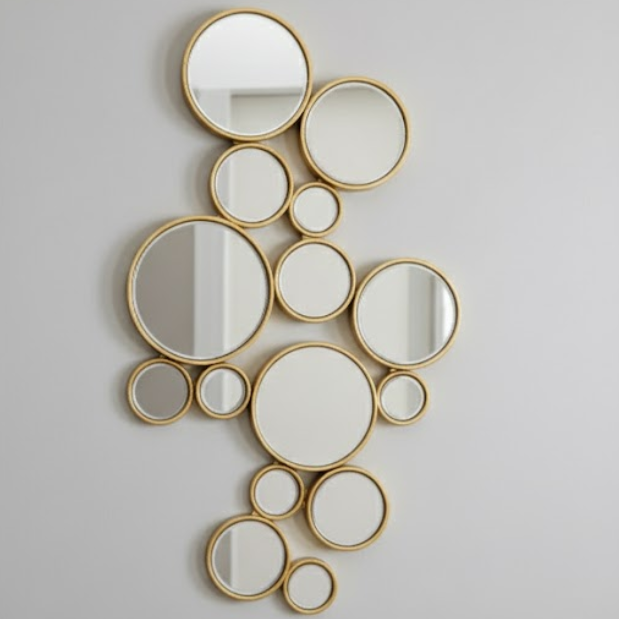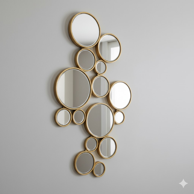 A second vertical arrangement of rounded mirrors offers a tighter, space-savvy footprint for niches and side walls while preserving the playful bubble motif. Multiple reflection points brighten compact rooms and create an artful focal with minimal visual weight.
