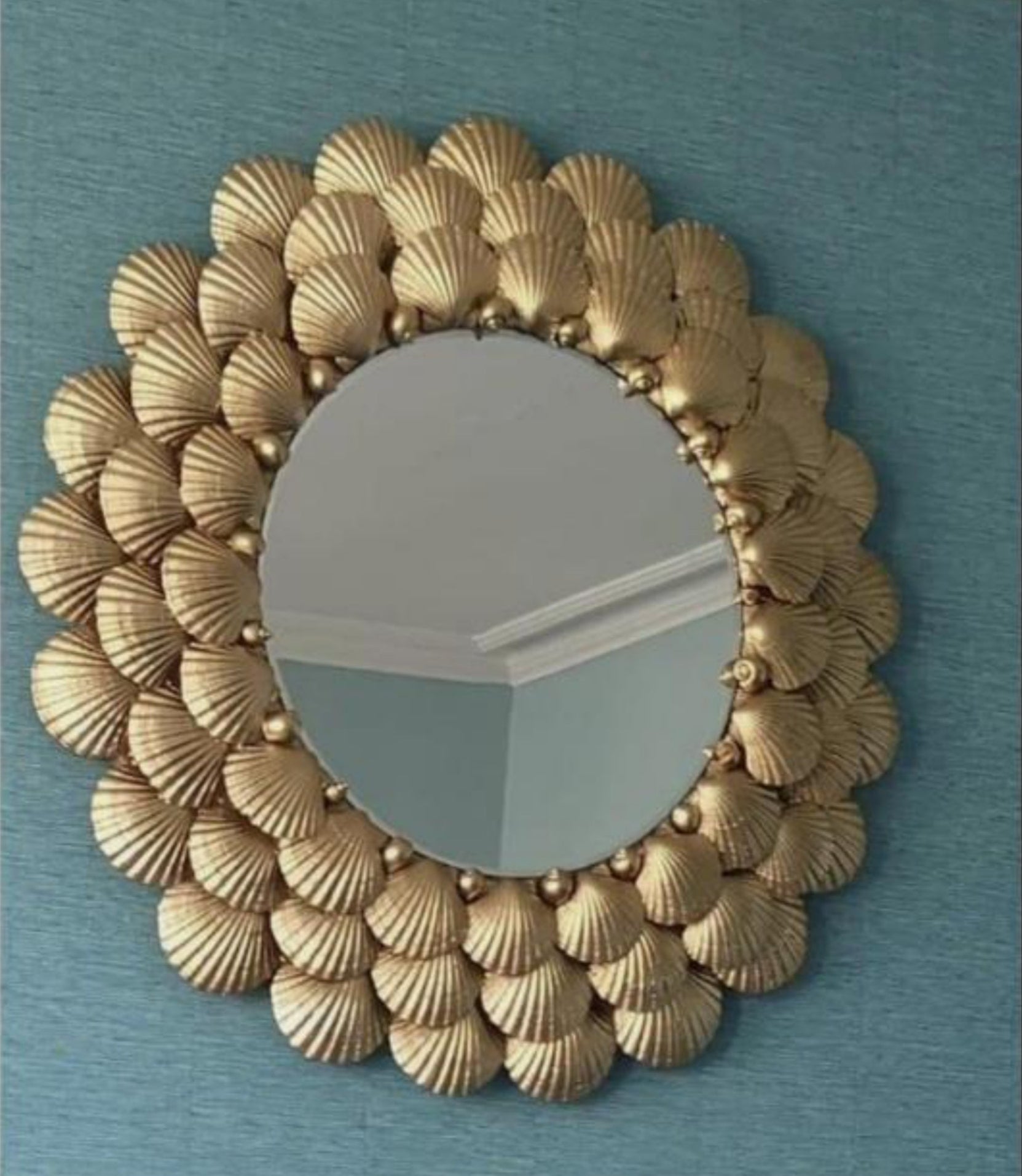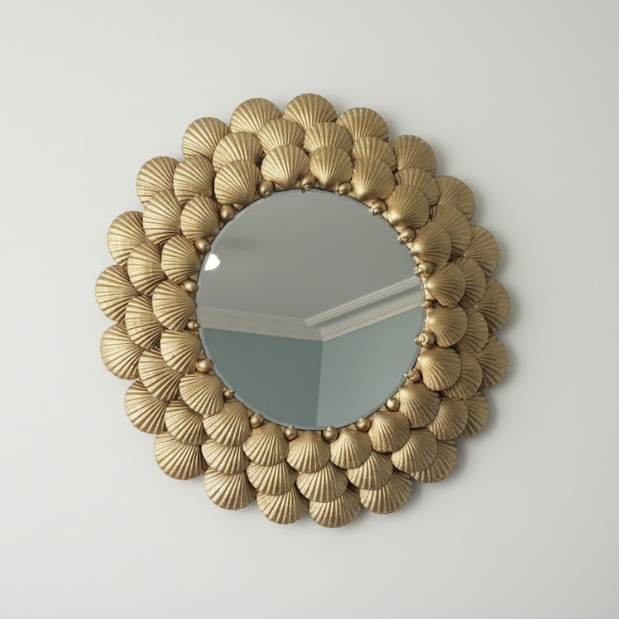 A layered wreath of sculpted shell forms surrounds a round mirror, creating a coastal-luxe halo that adds texture and gentle shimmer to entryways or living rooms. The rhythmic fluting on each shell catches light beautifully, while subtle spacer beads introduce depth and a handcrafted feel.