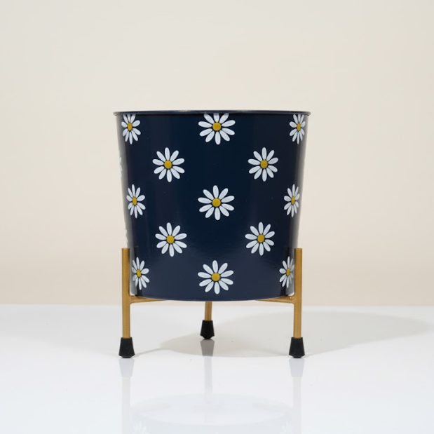 Add a modern accent to your home or workspace with the Contemporary Print Metal Pots with Stand collection—crafted from premium, high-quality steel, each pot stands 17 cm tall and 13 cm in diameter, with a durable gold-tone stand for an elevated look. Featuring vibrant prints like gold hearts, monstera leaves, daisies, and indigo batik, these planters blend style and color for living rooms, bedrooms, offices, or gifts. Their sturdy construction, unique patterns, and versatile size make them a perfect choice for decorating desktops, shelves, or window sills at Rs. 180 per piece.