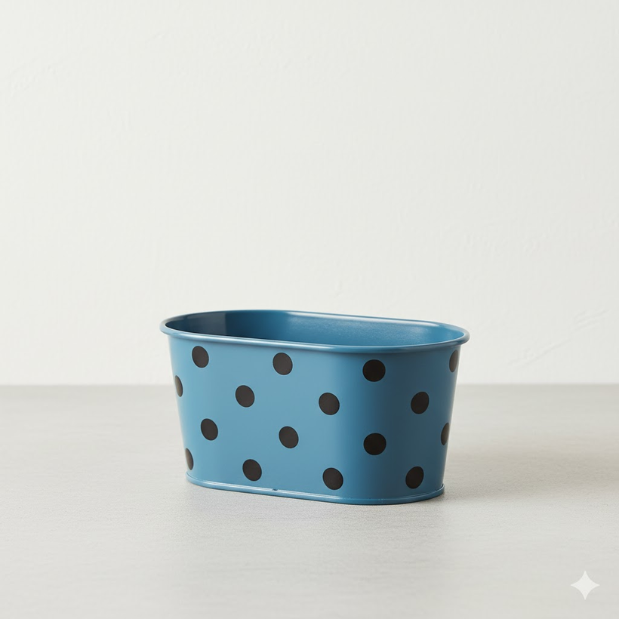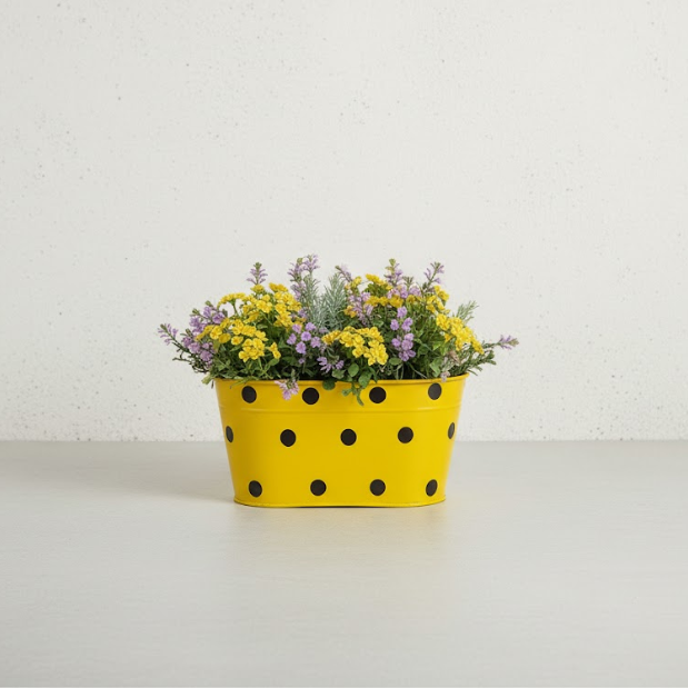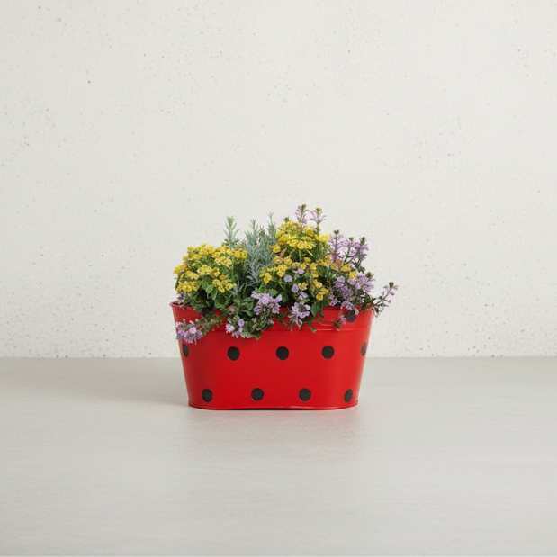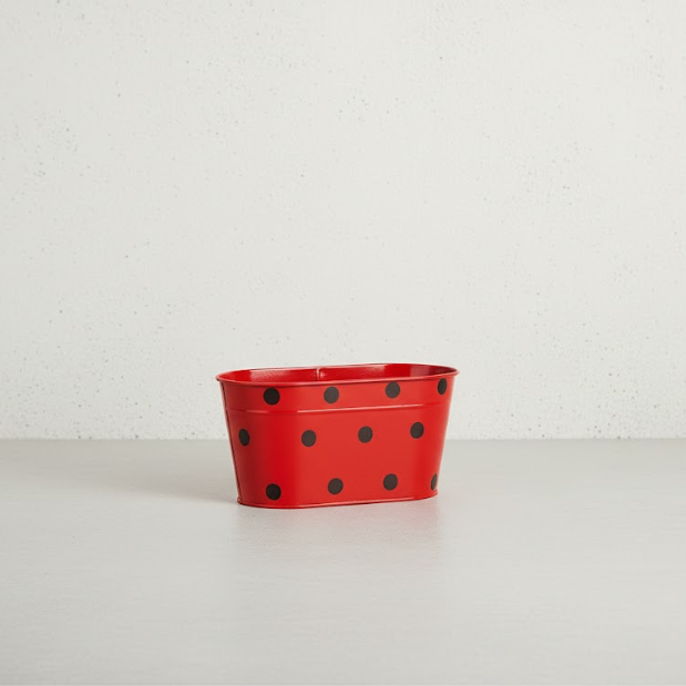 Add a cheerful splash of color to your space with the Polka Dot Steel Oval Pot, model no. 146 B, crafted from high quality steel for exceptional strength and long-lasting durability. Each planter showcases a playful polka dot pattern with a bright powder-coated finish, making it a lively choice for windowsills, shelves, balconies, or gardens. The sizable dimensions—height 12.5 cm, length 28 cm, width 18 cm, and base size of 23 x 12 cm—provide ample room for various plants, from flowers to foliage or herbs. Priced at Rs. 120 per piece, these oval pots blend sturdy function with contemporary style, ideal for enhancing indoor or outdoor décor.