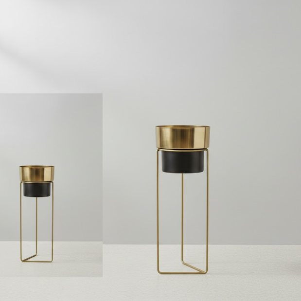 These Dual Tone Gold & Black Steel Planters (Set of 2) bring a luxurious contrast to contemporary interiors, crafted from premium steel with a chic gold top and elegant black base. Each set includes a large planter (70 cm height, 25 cm diameter) and a medium planter (60 cm height, 20 cm diameter), both featuring sturdy golden stands that elevate your plant displays with warmth and sophistication. Designed for versatility and lasting style, these planters are ideal for showcasing foliage or flowers in any modern home or office, priced at Rs. 1500 per set for enduring quality and striking visual appeal.