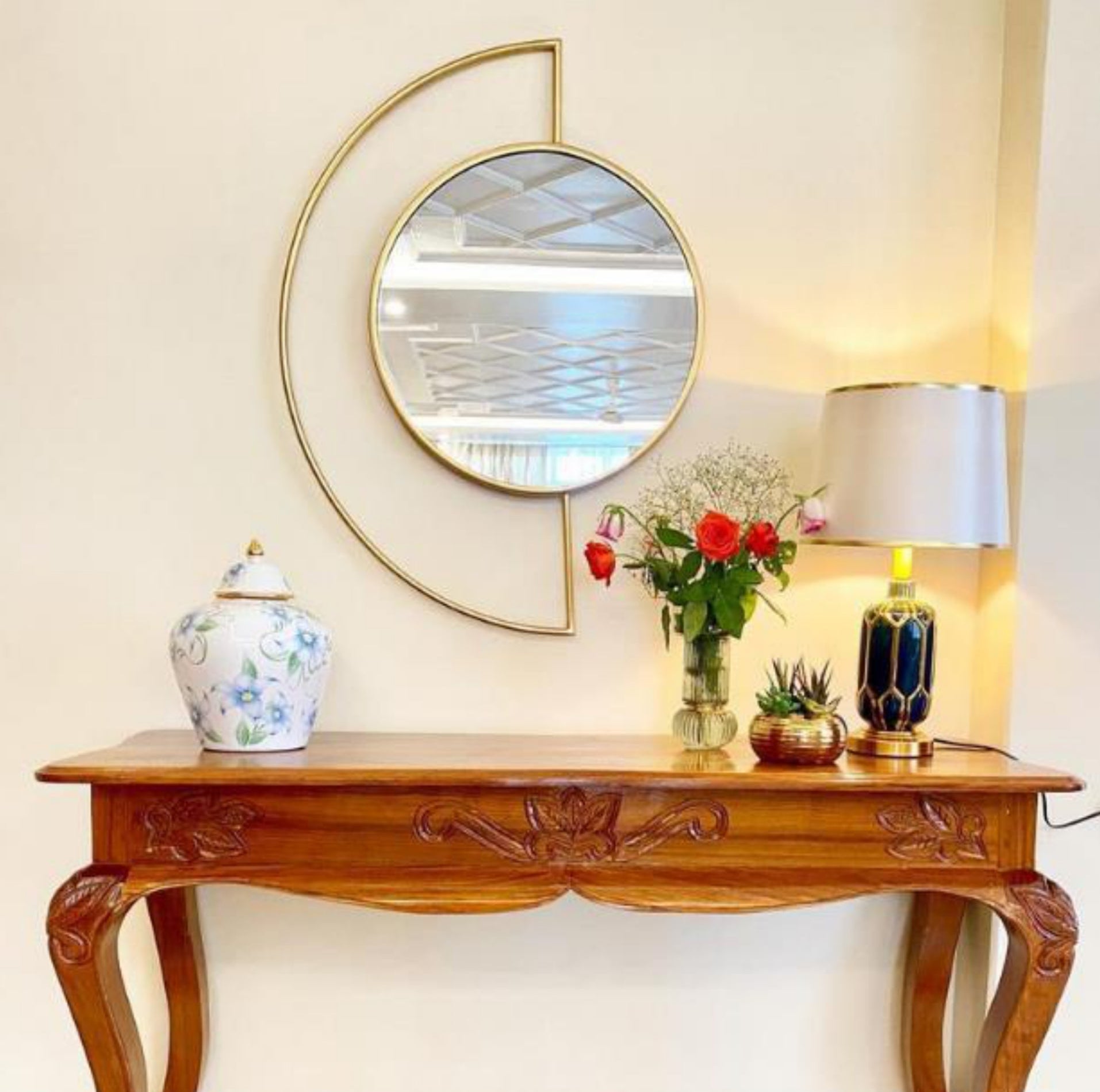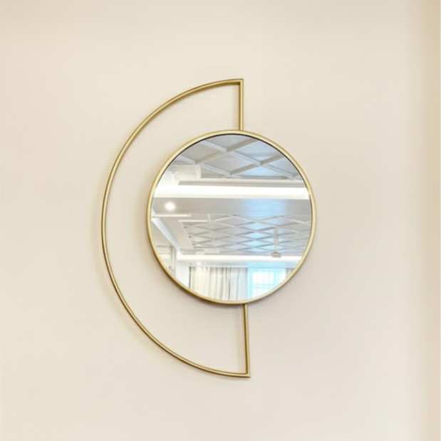 A sculptural crescent frame arcs around a floating round mirror to create a refined eclipse motif that elevates console tables, entryways, and dining walls. The offset geometry adds depth and negative space while the slim profile keeps the look modern and airy.