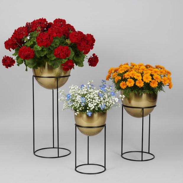 This set includes three elegant gold egg-shaped planters, each crafted from high-quality steel and paired with sleek black stands to elevate your indoor greenery. The collection features a large planter with a pot height of 24 cm and diameter of 26 cm, standing tall at 62 cm with its matching stand. The medium planter has a pot height of 20 cm and diameter of 22 cm on a 52 cm tall stand, while the small planter offers a pot height of 18 cm and diameter of 18 cm, raised to 42 cm by its stand. Designed to complement contemporary décor, each planter in this set is both durable and visually striking, making it ideal for living rooms, entryways, or office spaces. Display them together for a dynamic arrangement or use individually to enhance different areas—these planters bring a sophisticated touch to any setting while providing ample space for a variety of indoor plants. The premium steel construction ensures longevity and a luxurious finish, perfectly blending style with functionality for modern homes.