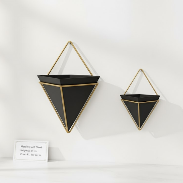 Elevate your indoor garden with the GeoChic Wall Planters, Model 167, crafted from premium high-quality steel. These uniquely triangular wall-mounted planters measure 15 cm in height and 12 cm in diameter, available in sleek black and crisp white finishes with gold accent frames. Ideal for contemporary spaces, these planters add a modern geometric touch to any wall, perfect for greenery displays in living rooms, office spaces, or balconies at Rs. 130 per piece.