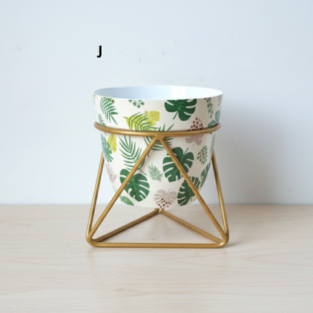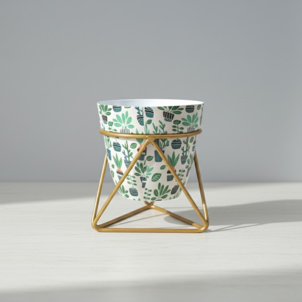 Add a fresh, artistic touch to your space with this Geometric Botanical Metal Pot Collection (Model 132 JKL), crafted from high-quality steel and finished with colorful, hand-illustrated botanical prints. Each 12 cm diameter, 15 cm tall pot features a modern geometric gold stand, making it perfect for desktops, shelves, or window sills. Designed for succulents, herbs, or small houseplants, this collection seamlessly blends contemporary style with vibrant nature-inspired charm, offering easy elegance for any room at Rs. 175 per piece.