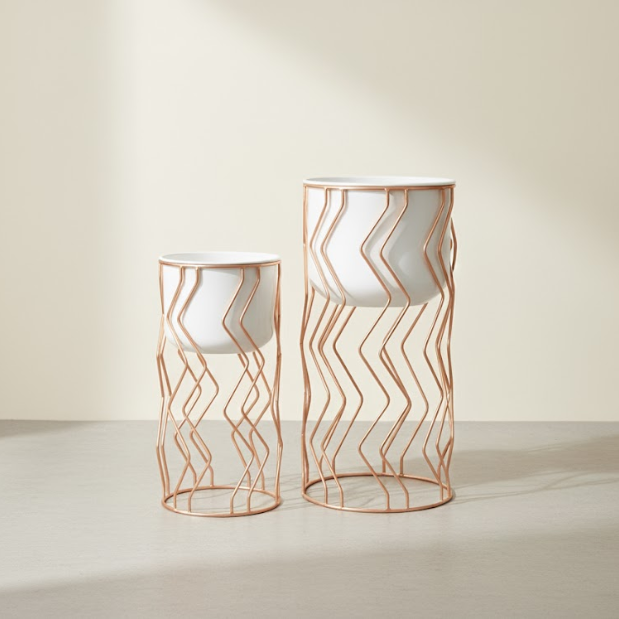 Perfect for medium-sized plants or arrangements, the Medium Tall Designer Zigzag Steel Planter offers the same eye-catching geometric gold frame but stands 50 cm high with a 22 cm diameter. Its high-quality steel construction ensures durability and style—ideal for modern homes, offices, or creative display spaces.