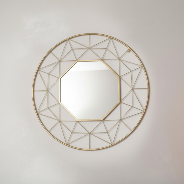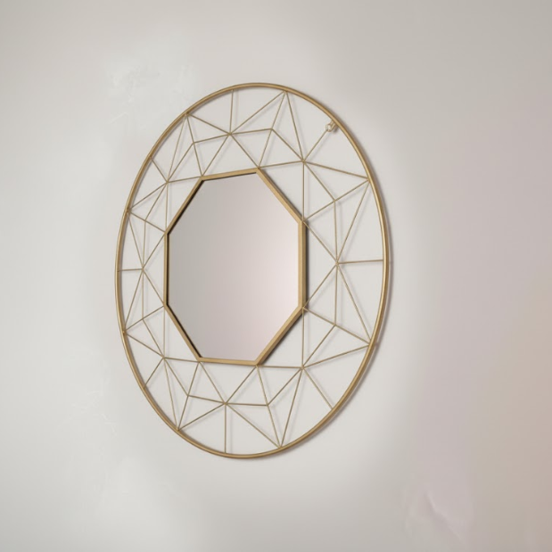 An octagonal mirror sits within a circular frame of fine, beaded triangle lines, forming a refined prism pattern that reads like contemporary wall art. The airy geometry keeps sightlines open while adding architectural interest above consoles or in dining nooks.