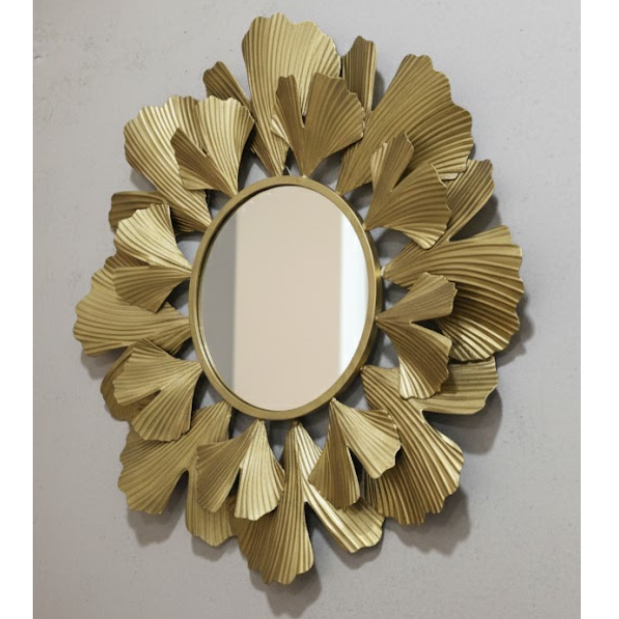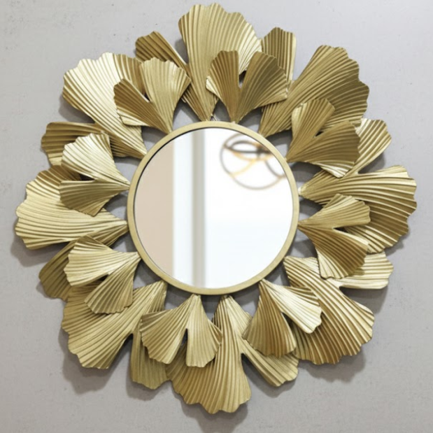 Ruffled ginkgo‑inspired petals encircle a round mirror, with fine ribbing that catches light and creates elegant shadows for a refined, organic statement. The open, airy silhouette keeps sightlines clear while delivering gallery‑grade presence in compact spaces.