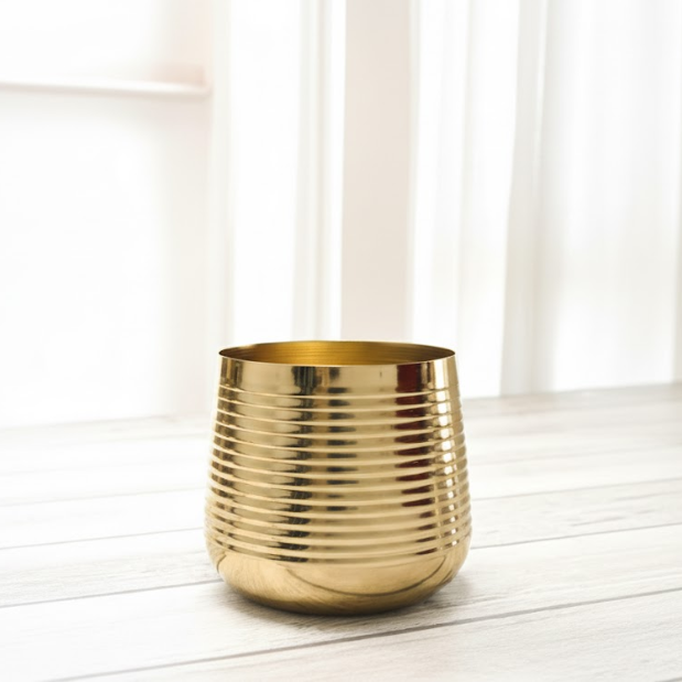 Add a touch of elegance to your home or office with the Gold Steel Decorative Metal Planter, expertly crafted from high-quality steel for impressive durability and shine. This stylish planter features a ribbed finish in a luxurious gold tone, making it a standout piece for desktops, shelves, or windowsills. Measuring 15 cm in height and 15 cm in diameter, it’s perfectly sized for small plants or floral arrangements, bringing modern sophistication and timeless charm to any space.