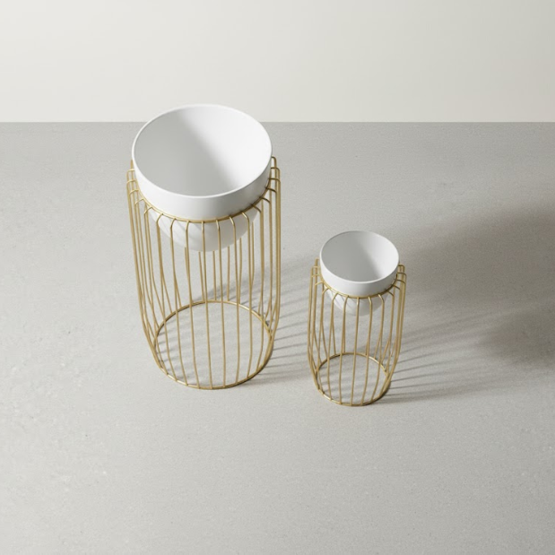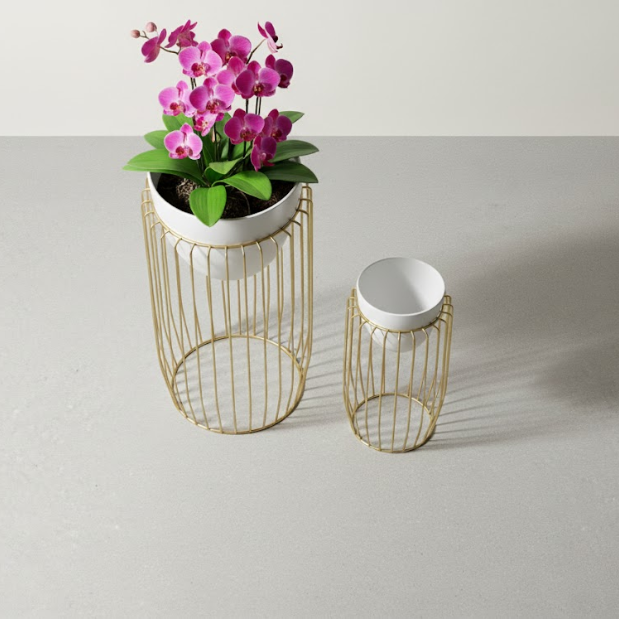 Make a bold modern statement with the Grandeur White Cage Steel Planters Set. Each planter features a premium steel pot in a matte white finish, beautifully cradled in a sculptural gold open-frame cage for a luxurious effect. With a large option (62 cm height, 26 cm diameter) and a medium option (44 cm height, 19 cm diameter), these planters create elegant, structured displays for standout foliage or statement arrangements. Their sturdy powder-coated construction ensures lasting strength and weather resistance, while the airy design brings sophistication to apartments, lobbies, offices, or hospitality spaces—all at Rs. 1700 per set.