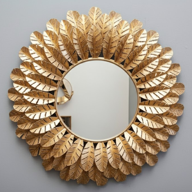 Dozens of hand‑formed laurel leaves encircle a round mirror in a rich, layered wreath that brings classical elegance and warm metallic glow to living and dining spaces. Detailed vein embossing on each leaf adds artisanal texture while the dense arrangement delivers gallery‑level presence.