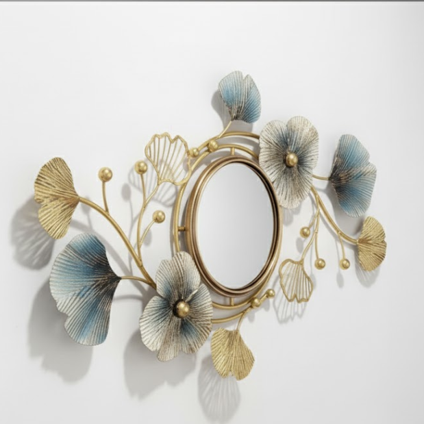 Bring luxury and sophistication to your home with this floral branch wall mirror, featuring golden stems adorned with delicate blue and gold leaves. The circular mirror at the center is framed with elegant floral details, making it not just a mirror but a statement piece of wall art. Crafted from durable aluminium and steel, it blends beauty with strength—ideal for living rooms, bedrooms, or reception areas.