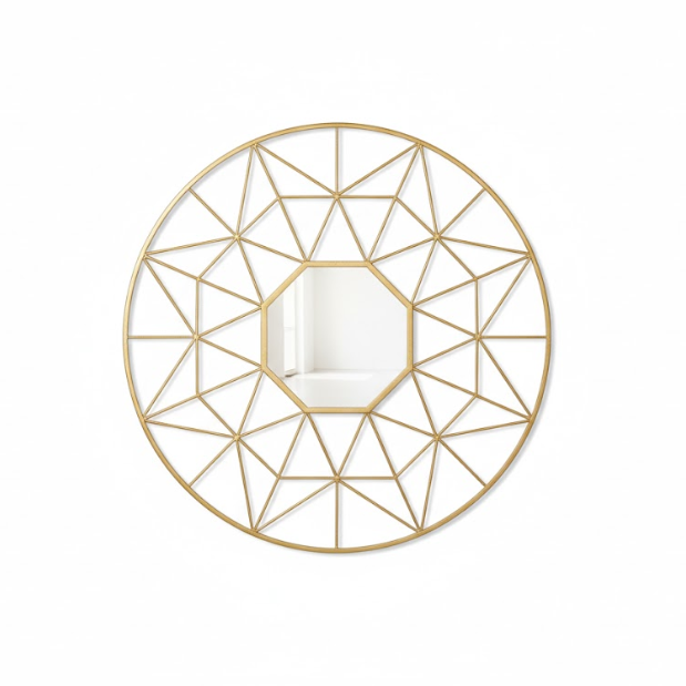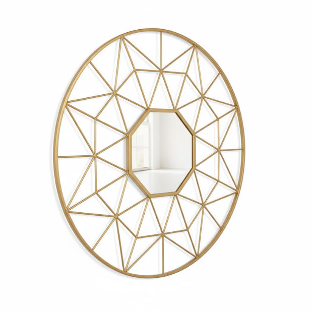 An airy ring of intersecting metal struts orbits a central octagon mirror, forming a faceted constellation that suits modern, luxe, and industrial interiors. The open lattice keeps the piece light while the champagne gold tone adds warmth above consoles, sofas, or dining buffets.