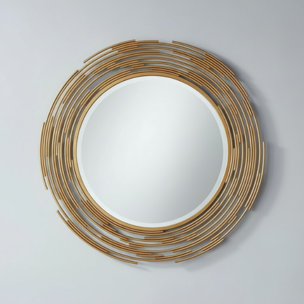 Concentric bands of slim metal batons ripple around a central mirror, creating texture, motion, and a luxe halo effect that elevates any feature wall. The alternating gaps lighten the profile while the warm metallic tone layers seamlessly with contemporary or transitional decor.