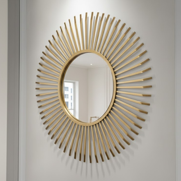 Evenly spaced slender batons radiate from a circular center to form a clean, modern sun motif that brightens foyers, bedrooms, and contemporary lounges. The slim profile keeps sightlines open while the warm metallic tone adds a refined hotel‑suite polish.