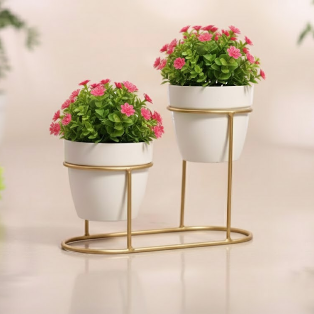 Elevate your indoor garden with this Elegant Small Golden Double Pot Stand (Model 133), crafted from high-quality steel with a luxurious gold finish. Measuring 21 cm in height, 27 cm in length, and 12 cm in breadth, it features two 12 cm diameter pots—available in graceful white or sleek black—that sit securely atop a stylish oval base. This dual planter stand blends modern design with functionality, perfect for showcasing your favorite plants in any home or office setting, priced at Rs. 250 per piece.