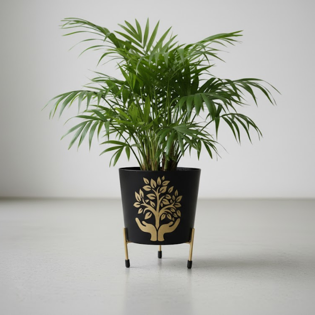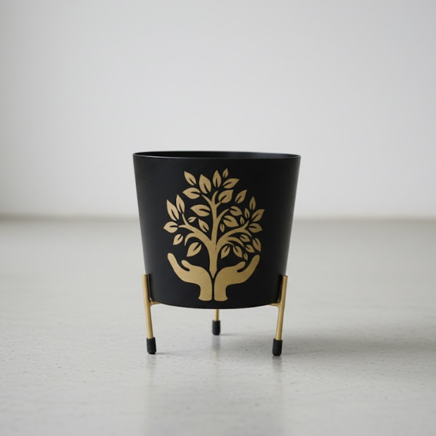 Add natural elegance to your space with the Nature Emblem Metal Pots with Stand collection—crafted from high-quality steel and finished in matte white or black. Each pot features a detailed gold tree or mandala motif, measures 17 cm in height and 13 cm in diameter, and sits on a sturdy metal stand for a touch of elevation and style. Ideal for displaying indoor plants or flowers, these pots combine durability and artistry, making them the perfect centerpiece for homes, offices, or thoughtful gifts at Rs. 170 per piece.