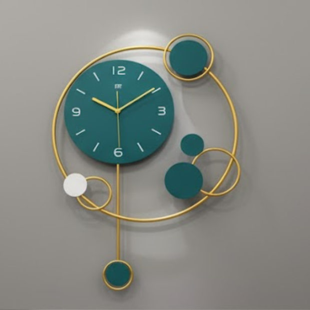 The Orbit Circles Modern Wall Clock Compact version is 16" x 27" with stylish overlapping circles in teal and gold. The silent quartz mechanism makes this clock perfect for compact modern interiors needing artistic flair.