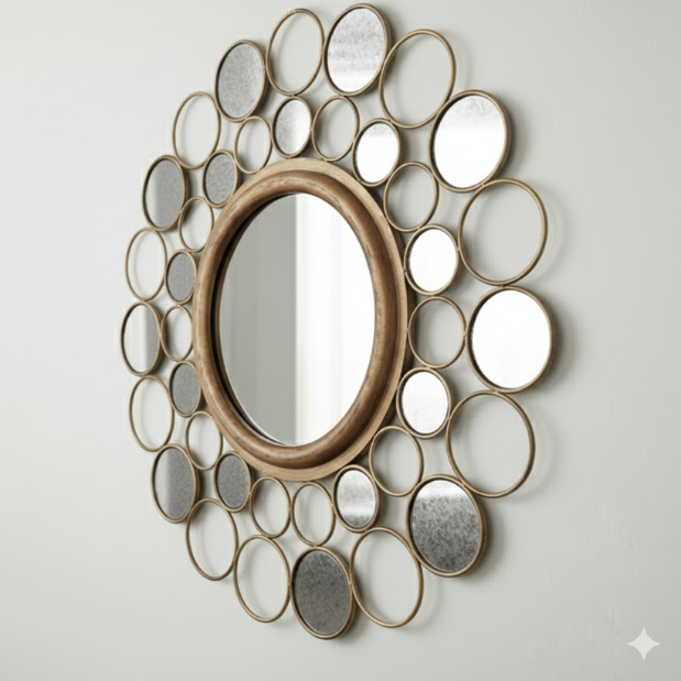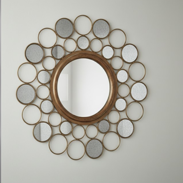 Varying circles radiate around a central round mirror like a celestial halo, mixing open rings with mirrored discs to amplify light and add sculptural rhythm to any wall. The airy composition reads as modern art while the central mirror remains practical above consoles, mantels, or sofas.