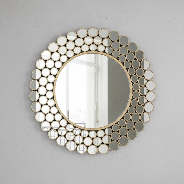 Graduated rings of small round mirrors ripple outward from a clear center, creating a luminous droplet effect that amplifies light and adds sculptural depth to any wall. The tight geometry reads modern yet elegant, perfect above consoles, dining buffets, and entryways.