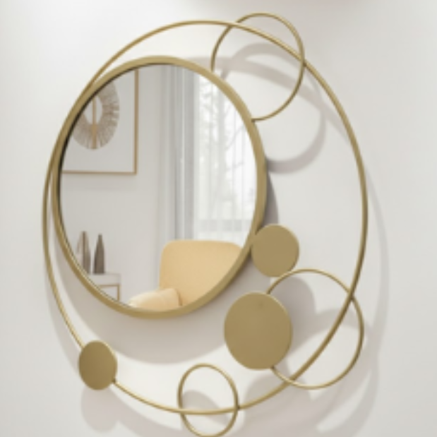 Overlapping rings and three sculptural discs orbit a central round mirror, composing a modern wall sculpture that balances movement with minimalism. The open geometry casts elegant shadows throughout the day, adding gallery-level depth above consoles or in living rooms.