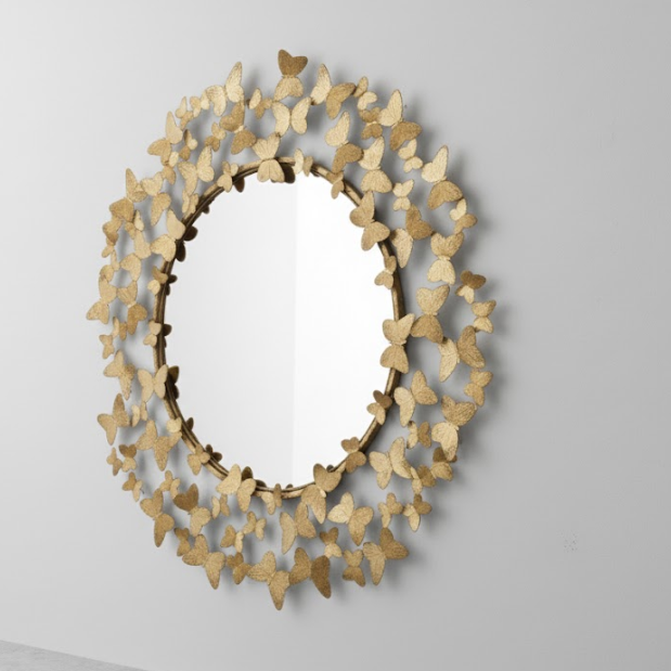 Dozens of petite, textural butterflies cluster into a circular wreath around a round mirror, adding whimsical elegance and sparkling light play to contemporary interiors. The layered wings create gentle shadows and a dynamic edge that reads luxurious yet playful above sofas or consoles.
