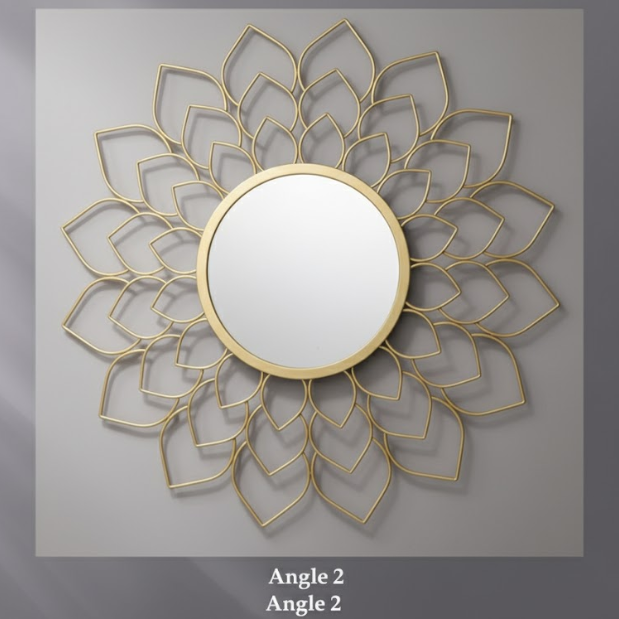 Interlocking petal motifs radiate from a central round mirror to form an airy sunburst that brings botanical elegance with modern geometry. The open lattice keeps the silhouette light and expansive, perfect for feature walls above sideboards, sofas, or beds.