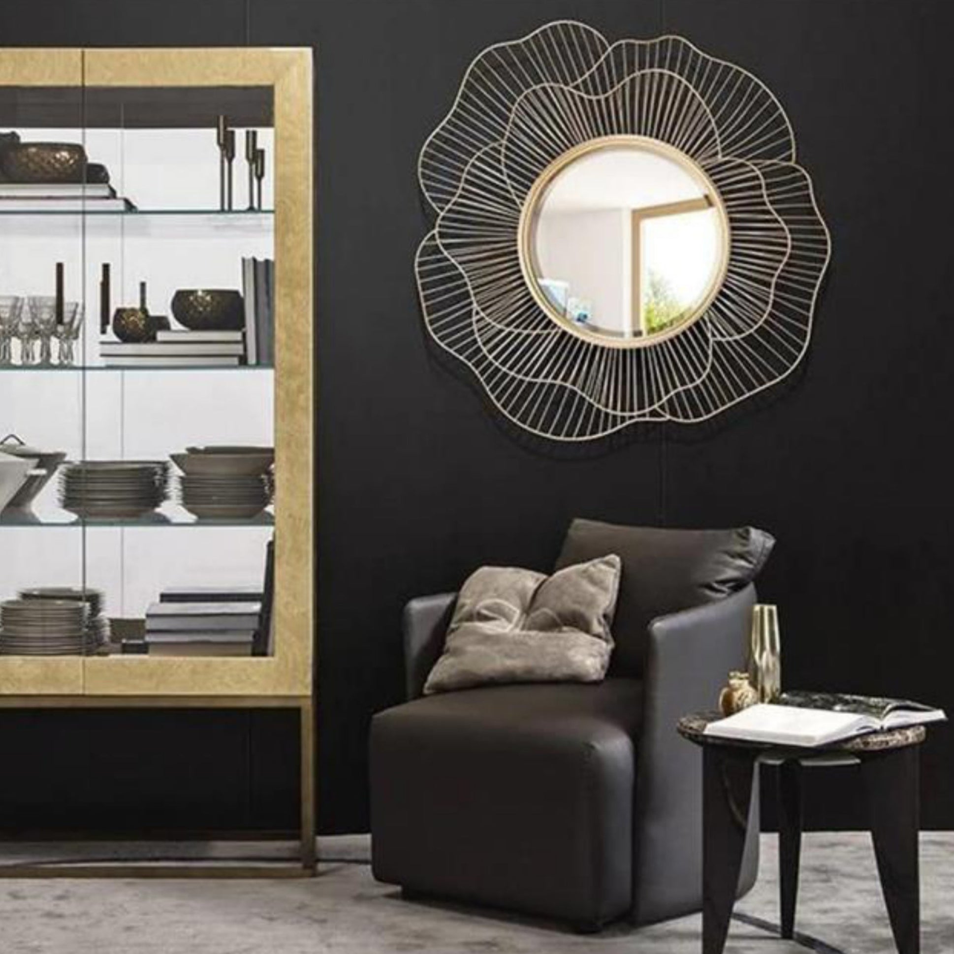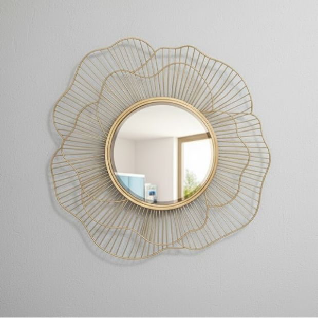 A delicate wire blossom unfurls around a round mirror, with fine linear veining that adds airy elegance and soft shadows to contemporary settings. The open silhouette keeps walls feeling spacious while providing a refined focal for lounges, dining rooms, or dressing areas.
