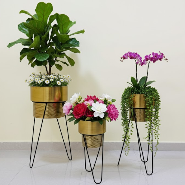 Premium Golden Steel Planter Set with Designer Stand – Set of 3