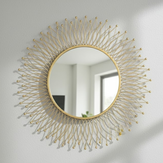 A precise lattice of interlaced metal rays creates a radiant halo around a clear round mirror, balancing crisp geometry with airy negative space for modern interiors. The repeat pattern delivers symmetry and sparkle without bulk, ideal above sofas or as a feature wall centerpiece.