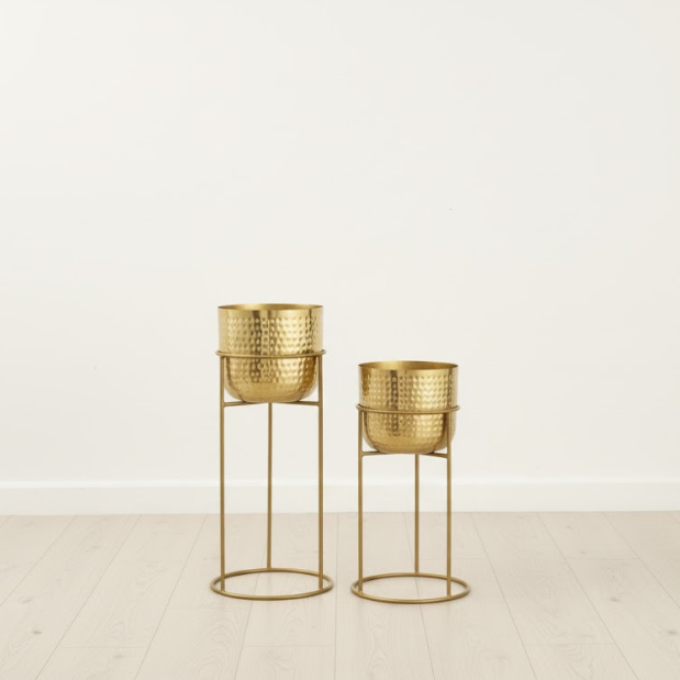This Regal Hammered Gold Steel Planter Set features two elegantly crafted planters made from high-quality, rust-resistant steel with a luxurious hammered gold finish. Each set includes one large planter (21 inches high, 7.5 inches diameter) and one small planter (17 inches high, 6.5 inches diameter), both perched on slender gold-finish metal stands for a sophisticated, coordinated display. Perfect for both indoor and sheltered outdoor use, these planters bring a touch of modern opulence and reliable durability to your living room, bedroom, entryway, or balcony. Their stylish texture, easy-care surface, and sturdy construction provide long-lasting glamour and functional versatility for all your favorite plants.