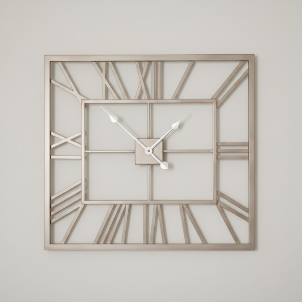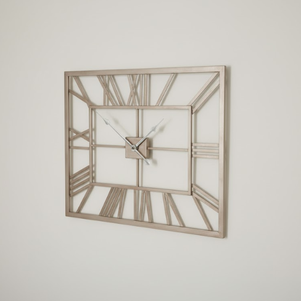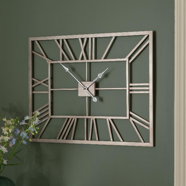 The Portrait Roman Halo Open-Frame Clock measures 20" x 16", emphasizing vertical design with classic Roman numerals and silent quartz movement for quiet function.