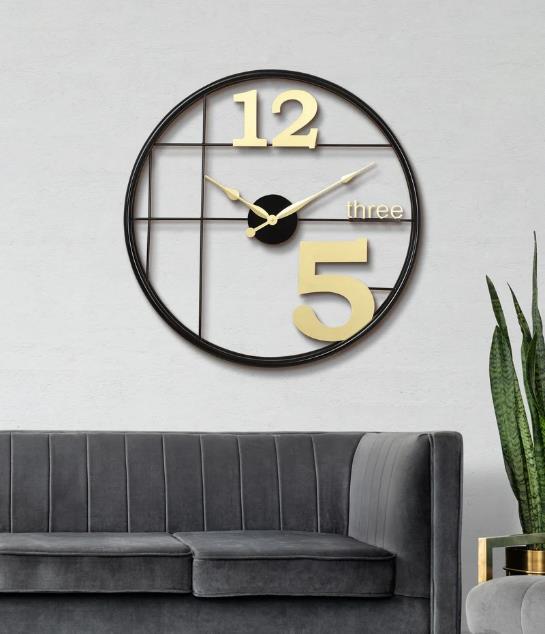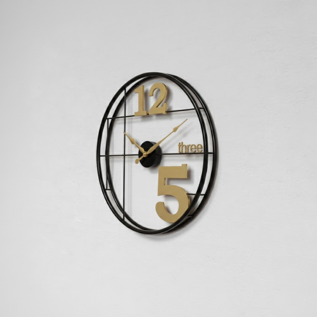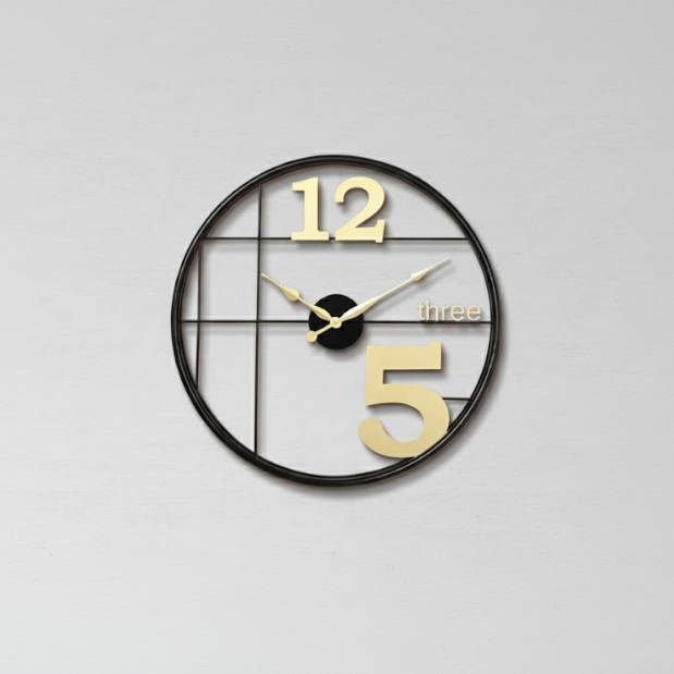 Elegant and modern, the Spoke Dial Word-Numeral Clock in gold presents a 24" x 24" open-frame with distinct word numeral markers and a silent quartz mechanism for noiseless timekeeping.