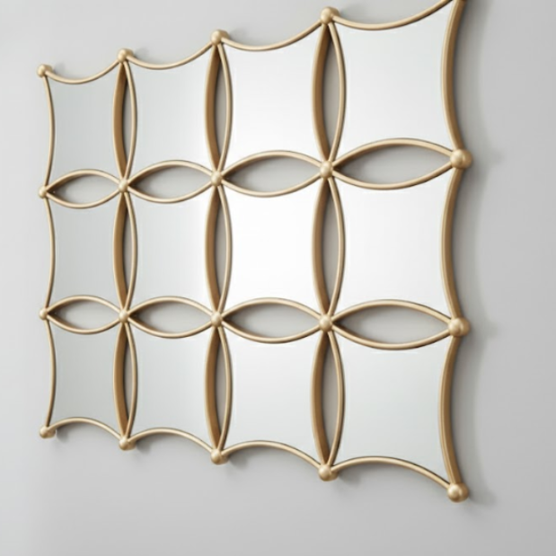 Twelve gently curved petal frames link together to form a sculptural rectangular mirror panel that reads like contemporary wall art. The repeating quatrefoil geometry brings rhythm and light to larger walls, perfect above consoles, dining buffets, or in bedrooms as a statement piece.