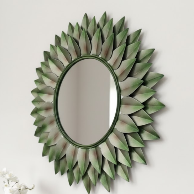 Layered metal petals in graduated green hues radiate from a central round mirror, bringing a fresh, botanical statement to living rooms, bedrooms, or hallways. The subtle ombré leaves add movement and depth while the slender rim keeps the design light and modern.