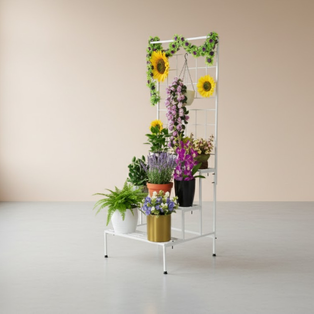 Add a touch of elegance to any space with the White Classic 3-Tier Steel Plant Stand, expertly crafted from high-quality steel for durability and style. Its impressive dimensions—height of 152 cm, length of 54 cm, and width of 60 cm—provide generous space to showcase your favorite plants. The three-tiered design creates multiple levels for display, while the decorative grid panel at the back allows you to hang smaller pots or decorative items with ease. Ideal for both indoor and outdoor use, its sturdy white steel frame ensures years of reliable support for your plant collection.