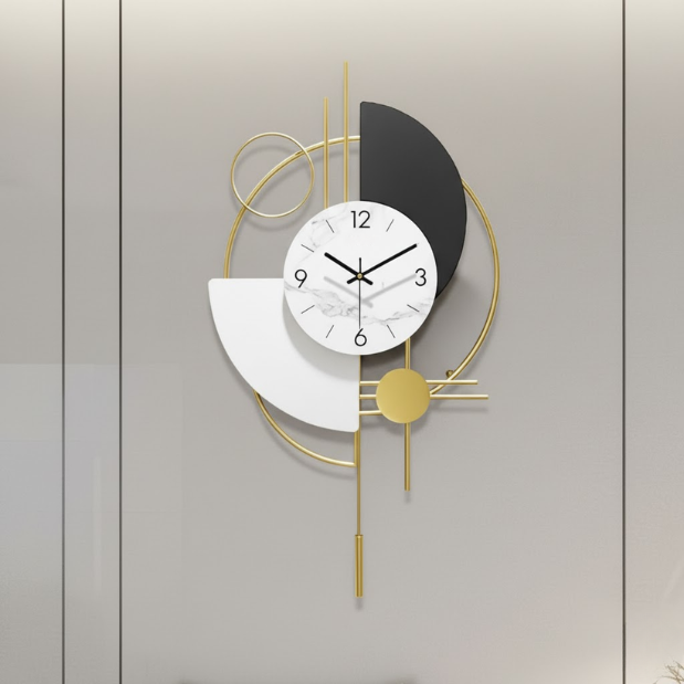 The Word Dial Spoke Clock in gold stainless steel offers a 16" x 16" open-frame with eight decorative spokes and written hour markers. Its silent quartz movement and easy AA battery power make it ideal for compact wall spaces.